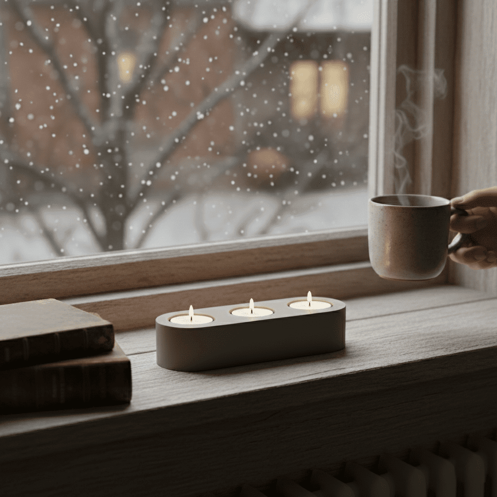 Minimalizm i rytuał: Nowoczesna forma na trzy świece tworzy harmonijną linię światła, która natychmiast wycisza wnętrze.